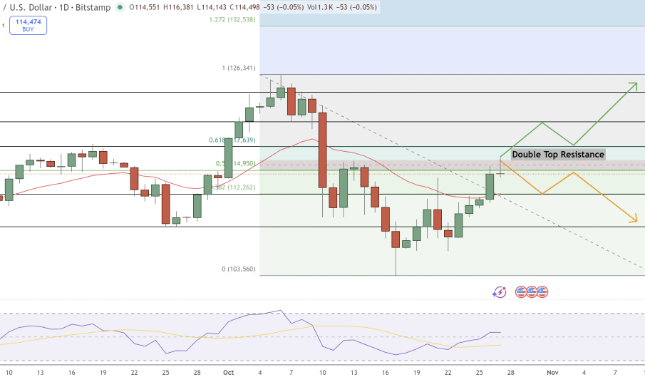Bitcoin (BTC/USD) is trading around $114,572, consolidating after rebounding from the $108,600 support zone. The daily chart shows a potential double-top pattern forming near $117,600, aligning with the 61.8% Fibonacci retracement, a key resistance level where sellers could reappear.